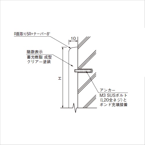 ・消灯直後は明るく発光します。30分後〜1時間では、徐々に発光が薄くなります。1時間後〜10時間では、文字の形が目視できる残光状態です。 [品番/呼称]NST01 [サイズ]H150mm、W80mm、D10mm [重量]95g [材質]エポキシ系樹脂・蓄光ガラスビーズ [仕上げ]クリアー塗装 [ご注意] ・文字を発光させるためには、事前に光りを当てておく必要があります。 ・アンカーと接着にて施工します。 購入に関する注意事項