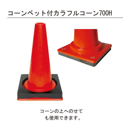 [色]緑、赤、青、黄、白[品番/呼称]700H [サイズ]H711mm×W380mm×D380mm [重量]3kg [材質]ポリエチレン 購入に関する注意事項 ・色をご指示ください。 ・コーンベット付きコーンは、コーンベットをのせる手間が不要で、コーンベットが目立たず、すっきりとした印象です。ジョイントピン(別売)によって脱着が可能です。