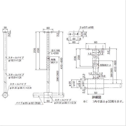 ハンガーパイプ等の支持部材としてご使用いただけます。本体先端部の管に丸パイプを通して使用します。 パイプφ25用とφ32用があります。 本体は捻じ込み式により長さ調節(410〜600mm)ができます。 [サイズ]表記による [本体重量]465g [材質]スチール [仕上]クロームメッキ ●耐荷重:100kgf 【ご注意】外での使用や、湿気の多い場所での使用はご遠慮ください。お届けの際、本体部材は2つに分解された状態です。取付時に太いパイプの中に細いパイプの部材を捻じ込んでいき、長さを調節してください。規格以外の長さも特注にて製作可能です。(規格品の調節可動範囲は190mm) 購入に関する注意事項