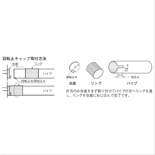 [サイズ]A38.5mm、B42.4mm、C31mm、D39.5mm、E6mm、F3mm、G10mm、H5mm、J4mm、K7mm[本体重量]73g [付属品]スチール十字穴付皿木ネジ 3.8×32:2本 3.8×32:1本 [材質]ZDC [仕上]クロームメッキ ●耐荷重:80kgf 【ご注意】回転止めキャップご使用の際は、パイプに切り込みが必要となります。パイプの回転止めにはスモールキャップと回転止キャップSをご使用ください。 購入に関する注意事項