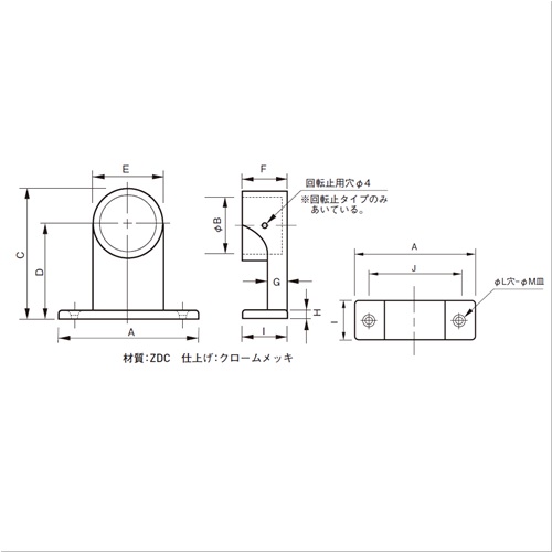 [サイズ]A:60mm、B:25.5mm、C:57mm、D:42mm、E:30mm、F:20mm、G:8mm、H:4.5mm、I:20mm、J:47mm、L:4.5mm、M:9mm[本体重量]87g [付属品]SUS十字穴付皿タッピンネジ(止・通 共通)4×30:2本 [材質]ZDC [耐荷重]60kgf 購入に関する注意事項 ・代表画像を表示しています。 特長 ・背面が平らなため両サイドまで有効利用できます。 ・一般手すり、ハンガー等のパイプ支えにご使用できます。 ・回転止タイプは、回転止用のビス穴(φ4)がブラケットの側面にあいているので、現場での穴あけ加工が必要なく施工を簡素化できます。 ご注意 ・梯子受としてはご使用になれません。 ・回転止タイプは、止のみです。通はありません。