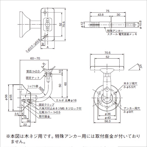 手すりブラケット(支持金具)としてご使用いただけます。持ち出し方向、10mmの許容範囲で調節可能です。 受皿の角度調節がドライバー1本で容易にできます。 [サイズ]R16mm、A29mm、B11mm [本体重量]246g [材質]SUS304 [仕上]ヘアーライン ●パイプ径:32 ●耐荷重(取付ピッチ900以内):120kgf 【ご注意】ブラケット取付けピッチは、900mm以内としてください。本体を取付座金の軸芯棒に取付ける際は六角穴付止ネジ(付属)2本をしっかり締めてご使用ください。木ネジ用の場合、出幅寸法は通常60 〜 70mmですが、10mmの出幅調整を効かせたタイプで出幅100 〜 110mmのものまで製作可能です。平受タイプも製作可能です。お問い合わせください。 購入に関する注意事項