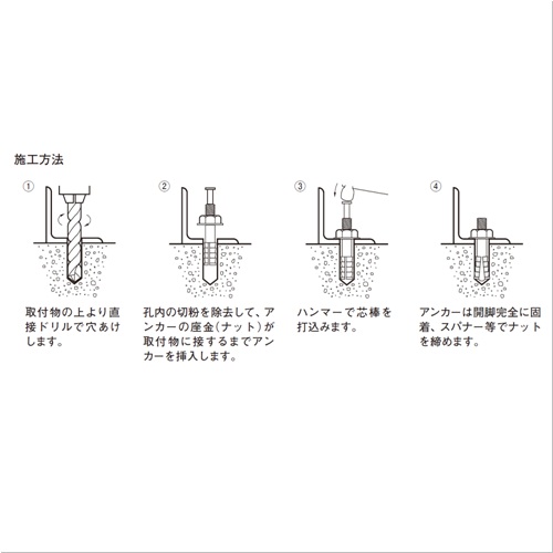 [品番/呼称]M10[サイズ]全長:120mm、ネジの長さ:30mm、ドリル径:10.5mm [材質]スチール [仕上げ]電気亜鉛メッキ [埋込み長さ]40mm [コンクリート穿孔深さ]45mm [有効締付厚]65mm [引抜]9.5kN [せん断]13.0kN 購入に関する注意事項 施工方法 (1)取付物の上より直接ドリルで穴あけします。 (2)孔内の切粉を除去して、アンカーの座金(ナット)が取付物に接するまでアンカーを挿入します。 (3)ハンマーで芯棒を打込みます。 (4)アンカーは開脚完全に固着、スパナー等でナットを締めます。 ご注意 ・施工時には必ず安全帽及び防塵メガネ等を着用してください。コンクリートへの穿孔深さは、埋込み長さ+芯棒つき出し長さとしてください。 ・入数単位にて受注承ります。