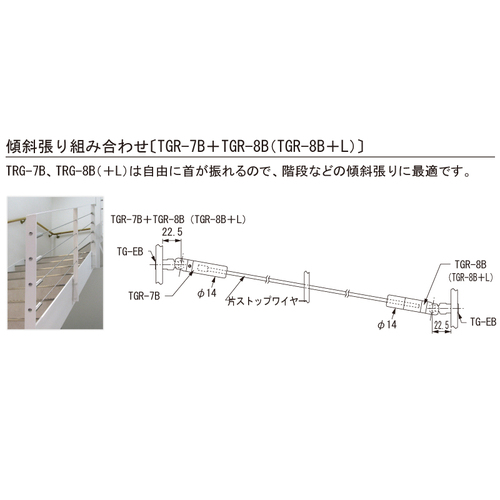 ・階段手摺り、防護柵にスプリングを利用して意匠的にワイヤーを張るためのシステムです。・極限の機能美を追求し、従来機能を保持しつつ金具が大幅に小さくなりました。 ・メンテナンス性が高く、シンプルな外観のため、都市空間を演出する製品として公共施設、商業施設、個人住宅等で幅広く使われています。 [品番/呼称]TGR-8B [サイズ]表記による [材質]SUS303 [ご注意] ・必ず標準品の片ストップワイヤーと組み合わせのうえ、ご使用ください。 ・片ストップワイヤーΦ3mmは、2m、3m、4m以外に、1m、6m、8mもございます。 ●備考:傾斜張り用金具(グリップテンション側) 連結用ボルトなし 購入に関する注意事項