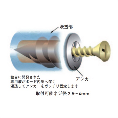 [本体重量]98g[材質]一液性ポリウレタン樹脂 [内容量]10ml [耐荷重]35kgf [セット内容]ネジロック16 専用液 10ml、アンカー16本、SUS十字穴付皿タッピンネジ4×30:16本、綿棒 2本 購入に関する注意事項 特長 ・待機時間なしで機材の取付けが速やかにできます。 (姉妹品の「どこでも下地スピードミニ」は硬化するまでの待機時間が必要ですが、即機材の取り付けが可能です。ただし、本t来の強度が出るのは液によって壁が強化されてからです。) ・壁自体を強化する仕組みですので、引抜・せん断試験ともに35Kg以上の強度がでます。 ・振動が継続して加わっても強度に殆ど変化はありません。 ・アンカーが空回りしてしまった時は、90分程度そのままにしておけば液が壁を強めアンカーを固定しますので、それからネジを機材に取付けてください。 ・容器のフタを開けても2年以上中身が硬化することはありません。 ご注意 ・専用液を塗り込んでから10分以内にアンカープラスドライバーで締め込みます。 ・90分程度そのままにしておけば、アンカーを強固に固定できます。 ・引抜・せん断耐荷重は35kgf、90分以内では10kgf程度。 ・幼児、子供の手の届かないところに保管し、いたずらをしないように注意してください。 ・接着用以外に使用しないでください。誤って指等に付着した場合はチリ紙等で拭き取り、硬化後お湯の中でこすり落としてください。 ・万一目に入った時はこすらずに水で洗い流し、医師の診断を受けてください。 ・衣服類に付着すると取除けませんのでご注意ください。(早い時間内に拭き取ってください。) 用途 [使用可能な壁等の素材] ・カーテンレール・タオル掛け・タオルクリップ・フック(衣装、帽子掛け)・鏡・ピクチャーレール・額縁・掛け時計・耐震用金具・エアコン・トイレットペーパーホルダー・吊る戸・棚・電話機・配電盤・リモコン・各種配管支持財・手すり:手すり荷重120Kgf以上(BL)の取付けには、「どこでも下地」(姉妹品)をご利用ください。 [その他の用途(専用液だけの使用)] ゆるんだネジの強固なシメ直しができます。食器棚や机等の木および金属全般、通常のプラスチック等大半の固い素材に使えます。