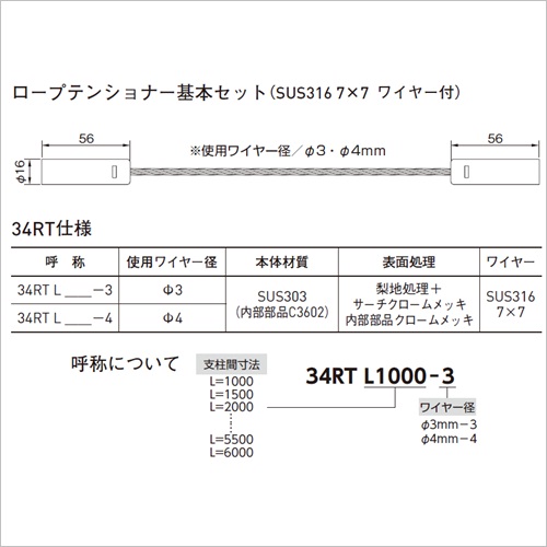 ・現場でワイヤーをカットして挿し込むタイプです。・現場で調整できるので、らせん階段や円形のベランダなど寸法測定が困難な場合などに便利です。 ・シンプル形状かつコンパクトなので、視界の邪魔にならず、空間を広く感じさせます。 ・光沢を抑えた上質な質感です。(梨地処理+サーチクロームメッキ) ・作業者が一人でも簡単に取付け可能です。 ・専用スパナとワイヤーカッターのみで簡単に取付けできます。 ・テンションスプリングで弛みの出ない構造で、誰が施工しても強度のバラツキがありません。テンションの調節も簡単に行えます。 ・最長で6mの長さまで取付け可能です。 ・水平・傾斜・壁面など様々な取付けが可能です。 ・ワイヤーにはもらい錆びの被害を受けにくいSUS316を使用しています。 ・専用部品でイタズラによる取外しが困難です。 [品番/呼称]34RT-L1000-3 [ご注意] ・各金具の材質はSUS304。本体sRTC、本体sRTS、終端座金D4はSUS303。ワイヤー(7×7)はSUS316です。 ・本体金具を取付ける支柱(フラットバー)は反りを防ぐため丈夫なものにしてください。目安として手摺の高さ1100mmの場合、支柱の厚みは12mm以上にて。 ・ロープテンショナーのワイヤーロープは、片端末ロープです。現場で任意の長さにカットしてご使用いただけますが、必ず片端末ロープをご使用ください。 ・ワイヤーロープ破断強度は、ワイヤー径Φ3(489kgf)、Φ4(834kgf)です。 ・ロープテンショナー基本セットは、ワイヤーロープ径Φ3mmとΦ4mmのどちらかお選びいただき、ワイヤーロープの長さは1m〜6mの範囲で500mmごとに受注承れます。 ・本体取付金具は、ワイヤーロープの径Φ3とΦ4に共通してご使用になれます。 ●セット明細:Φ3mmワイヤー 1m、SUS両端金具込み(止め金具+調整端子付) ●34RT仕様:呼称:34RT L-3、使用ワイヤー径:Ф3、本体材質:SUS303(内部部品C3602)、表面処理:梨地処理+ サーチクロームメッキ 内部部品クロームメッキ、ワイヤー:SUS316 7×7 購入に関する注意事項