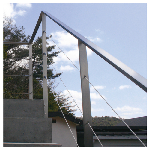 ・現場でワイヤーをカットして挿し込むタイプです。・現場で調整できるので、らせん階段や円形のベランダなど寸法測定が困難な場合などに便利です。 ・シンプル形状かつコンパクトなので、視界の邪魔にならず、空間を広く感じさせます。 ・光沢を抑えた上質な質感です。(梨地処理+サーチクロームメッキ) ・作業者が一人でも簡単に取付け可能です。 ・専用スパナとワイヤーカッターのみで簡単に取付けできます。 ・テンションスプリングで弛みの出ない構造で、誰が施工しても強度のバラツキがありません。テンションの調節も簡単に行えます。 ・最長で6mの長さまで取付け可能です。 ・水平・傾斜・壁面など様々な取付けが可能です。 ・ワイヤーにはもらい錆びの被害を受けにくいSUS316を使用しています。 ・専用部品でイタズラによる取外しが困難です。 [品番/呼称]34RT-L1000-4 [ご注意] ・各金具の材質はSUS304。本体sRTC、本体sRTS、終端座金D4はSUS303。ワイヤー(7×7)はSUS316です。 ・本体金具を取付ける支柱(フラットバー)は反りを防ぐため丈夫なものにしてください。目安として手摺の高さ1100mmの場合、支柱の厚みは12mm以上にて。 ・ロープテンショナーのワイヤーロープは、片端末ロープです。現場で任意の長さにカットしてご使用いただけますが、必ず片端末ロープをご使用ください。 ・ワイヤーロープ破断強度は、ワイヤー径Φ3(489kgf)、Φ4(834kgf)です。 ・ロープテンショナー基本セットは、ワイヤーロープ径Φ3mmとΦ4mmのどちらかお選びいただき、ワイヤーロープの長さは1m〜6mの範囲で500mmごとに受注承れます。 ・本体取付金具は、ワイヤーロープの径Φ3とΦ4に共通してご使用になれます。 ●セット明細:Φ4mmワイヤー 1m、SUS両端金具込み(止め金具+調整端子付) ●34RT仕様:呼称:34RT L-4、使用ワイヤー径:Ф4、本体材質:SUS303(内部部品C3602)、表面処理:梨地処理+ サーチクロームメッキ 内部部品クロームメッキ、ワイヤー:SUS316 7×7 購入に関する注意事項
