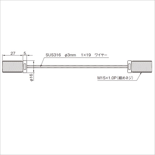 ・木材取付け専用のワイヤー手すりです。(水平張り専用)・目立たずに空間を広く感じさせることが、ワイヤー手すりのメリットです。本体金具を埋め込むことで、金具が目立たなくなります。 ・薄手のステンレス柱のように本体金具が飛び出さないので、美観だけでなく安全性にも寄与します。 ・現場でワイヤーをカットして調整できます。一人でも簡単に取付け可能です。 [品番/呼称]3WT-L6000-C [サイズ]Φ3mm×6000mm [材質]本体:主要部:SUS304、内部:C3602 使用ワイヤー:SUS316 1×19 Φ3mm [ご注意] ・中間支柱は1500mmピッチ以内を目安にしてください。 ・ワイヤロープの長さは500mmピッチで、L=1000〜6000mmまでの間で受注承れます。 購入に関する注意事項