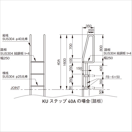 ・縦桟がΦ40丸棒の頑丈なタイプです。頭部Aタイプは、踏棒(KUステップ41)か踏板(KUステップ40)がついています。・縦桟がΦ25丸棒のものもございます。(KUステップ42) ・連結の際は、止めビスで抜けを防止します。(縦桟Φ40のみ) [品番/呼称]40A [サイズ]Φ40mm×1600mm×400mm [重量]68kg [材質]SUS304 [仕上げ]研磨 [ご注意] ・KUステップ40は、タラップはローレット加工なし。頭部のAタイプは踏棒ではなく踏板です。平成13年版国土交通省仕様で現行版とは異なります。 ・付属のブラケットが先付か後付かをお選びください。 ・ご要望に合わせ、別寸法も製作可能です。 ・オプションで背もたれ(安全ガード)、ALC用押さえ板、コの字型ブラケット、端部キャップをご用意できます。 ・納期:お問い合せください。 ●備考:平成13年版国土交通省仕様、(現行版とは異なる)縦桟Φ40、A部踏板 購入に関する注意事項