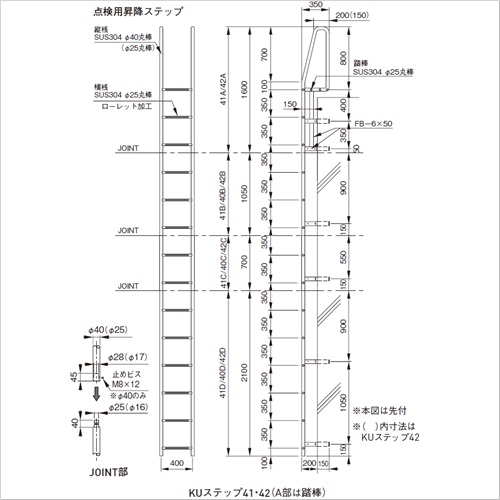 ・縦桟がΦ40丸棒の頑丈なタイプです。頭部Aタイプは、踏棒(KUステップ41)か踏板(KUステップ40)がついています。・縦桟がΦ25丸棒のものもございます。(KUステップ42) ・連結の際は、止めビスで抜けを防止します。(縦桟Φ40のみ) [品番/呼称]40D [サイズ]Φ40mm×2100mm×400mm [重量]52kg [材質]SUS304 [仕上げ]研磨 [ご注意] ・KUステップ40は、タラップはローレット加工なし。頭部のAタイプは踏棒ではなく踏板です。平成13年版国土交通省仕様で現行版とは異なります。 ・付属のブラケットが先付か後付かをお選びください。 ・ご要望に合わせ、別寸法も製作可能です。 ・オプションで背もたれ(安全ガード)、ALC用押さえ板、コの字型ブラケット、端部キャップをご用意できます。 ・納期:お問い合せください。 ●備考:平成13年版国土交通省仕様、(現行版とは異なる)縦桟Φ40、A部踏板 購入に関する注意事項