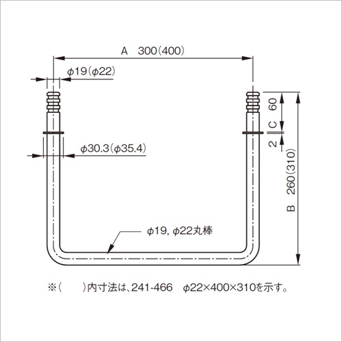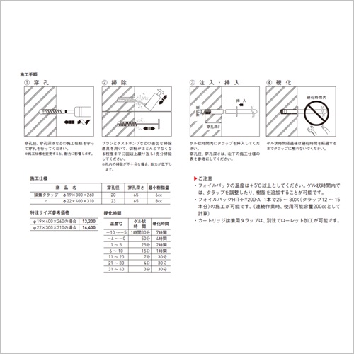 [サイズ]A300mm、B260mm、C60mm[本体重量]1.8kg [材質]SUS304 [仕上]ピーリング ●耐荷重:1000kgf ●施工仕様:商品名:接着タラップφ19×300×260 穿孔径:20 穿孔深さ:65 最小樹脂量:6cc 商品名:接着タラップφ22×400×310 穿孔径:23 穿孔深さ:65 最小樹脂量:8cc ●硬化時間:温度℃:-10〜-5 ゲル状時間:1時間30分 硬化時間:7時間 温度℃:-4〜0 ゲル状時間:50分 硬化時間:4時間 温度℃:1〜5 ゲル状時間:25分 硬化時間:2時間 温度℃:6〜10 ゲル状時間:15分 硬化時間:1時間 温度℃:11〜20 ゲル状時間:7分 硬化時間:30分 温度℃:21〜30 ゲル状時間:4分 硬化時間:30分 温度℃:31〜40 ゲル状時間:3分 硬化時間:30分 【ご注意】フォイルパックの温度は+5℃以上としてください。ゲル状時間内では、タラップを調整したり、樹脂を追加することが可能です。カートリッジ接着用タラップは、別注でローレット加工が可能です。 購入に関する注意事項
