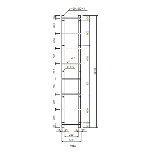 [サイズ]H:2200、W:350、D:150[本体重量]約21kg [材質]SUS304 [仕上げ]アングル:ヘアーライン、丸棒:ピーリング 購入に関する注意事項 【要別途送料】別途送料が必要な商品です。詳細は営業へお問合せください。代表画像を表示しています。 ご注意 ・ステンレス製の足掛け丸棒φ16は別注でローレット加工が可能です。φ19・φ22も製作可能です。 ・運搬諸経費は別途お問い合わせください。