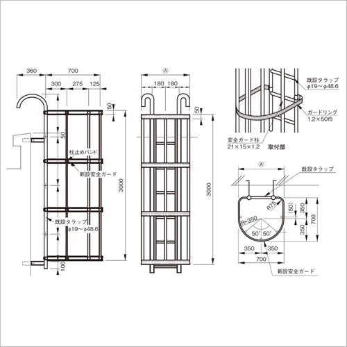 [材質]SUS304[仕上]ヘアーライン [サイズ]3000×700 [備考]縦桟φ19〜φ48.6 [重量]21kg 購入に関する注意事項 【要別途送料】別途送料が必要な商品です。詳細は営業へお問合せください。 ご注意 ・既設タラップの縦桟サイズはφ19、φ22、φ25、φ27.2、φ32、φ34、φ38、φ42.7、φ48.6対応のブラケットをご用意しています。縦桟のサイズをご指示ください。 ・タラップ側のW寸法((A)部)は、タラップの縦桟サイズおよび幅により増減します。 ・既設タラップサイズをご指示ください。 ・L=4000まで特注にて製作可能です。又、L=4000以上はジョイントにて特注製作可能です。
