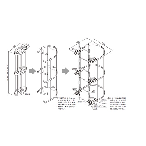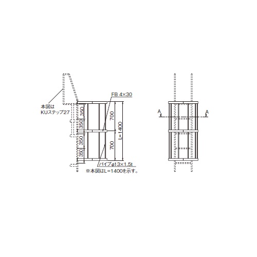 [サイズ]H1400mm×W700mm[本体重量]10.6kg [材質]SUS304 [仕上]ヘアーライン [備考]縦桟φ25用 [セット内容]本体:L=1400(1300) 取付ブラケット:6個 SUS M8ボルト L=30,ナットワッシャー:2個,スプリングワッシャー:12組 購入に関する注意事項 特長 ・耐食性・耐候性に優れたステンレス製です。 ・3段階の折畳み式になっており、梱包時に容積が小さくなるので、運送費用が圧縮できます。 ・コンパクトにまとまっていることから、現場での取り回しも良く、場所によっては重機を使用せずとも荷揚が可能です。 ・本体はブラケットとボルトでの固定により、特別な工具は必要とせず取付けが可能です。 ご注意 ・本製品は後付式です。既設のKUステップまたは支柱(縦桟)径φ25のステップに設置可能です。他の径も別注で製作可能です。 ・パイプステップやPSステップ用も取付ブラケットが違いますが、特注にて製作可能です。