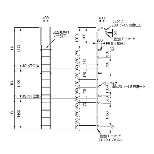 [サイズ]H1875mm、W400mm[本体重量]12.5kg [材質]SUS304 [仕上]サテンバフ研磨・ヘアーライン 購入に関する注意事項 【要別途送料】別途送料が必要な商品です。詳細は営業へお問合せください。 ・ブラケットはA, B, C共2組必要です。 ご注意 ・安全ガード・昇降禁止板も製作可能です。お問い合わせください。