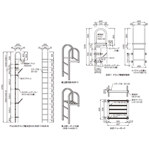 ・耐久性に優れたアルミ部材(アルマイト処理)を使用し、腐食しにくく、長期間の使用に耐えられます。・ブラケットが自由にスライドするため細かな調整が可能です。 ・最上部のパラペット側にステップを付けた事により仕上げ(笠木等)を踏みつける事なく昇降できます。 ・本体色はアルマイトシルバー(S)、ダークブロンズ(DB)、ステンカラー(ST)、ブラック(B)の4色をラインナップ。 購入に関する注意事項 ・規格品には、中間ジョイントはセットされていますが、取付ブラケットはセットされていません。別途ご注文ください。 ・代表画像です。 ご注意 ・施工する前に取付現場での入念な打合せの上、ブラケット取付部分の下地(壁)等の強度を充分確かめてから施工をお願い致します。 ・ブラケット取付面は付属のゴムパッキンを使用し、漏水防止の為コ ーキング等の充填の処置をお願い致します。 ・本製品の取り扱いに際して、壁面の強度、アンカー施工による本体の変形、使用対象外の設置による破損については責任を負いかねます。 ・本製品に当社規定以外の物は取付けしないでください。(アンテナ、煙突他)電気コード等を巻き付けないでください。 漏電、感電の恐れがあります。 ・ASB-1、ASB-2は、アルマイト材を曲げ加工しています。 ・頭部手掛け(ASB-1、ASB-2)には、ブラケットを2組取付けてください。 ・最上部ブラケットの取付け位置は頭部の最上部から1200mm以内で取付けてください。 ・最下部ブラケットは、本体最下部から450mm以内に取付けてください。 ・タラップブラケット取付ピッチは1200mm以内で設置してください。 ・タラップ(長さ、幅、ステップピッチ)、取付ブラケット(D≦1200)の規格外寸法の製作が可能です。