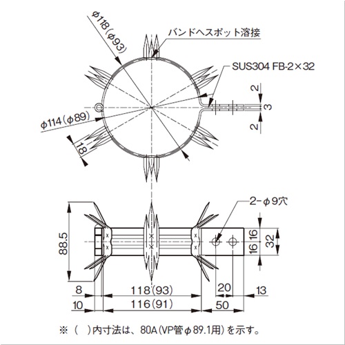 塀やフェンス上の忍び返しと同様に、ドレンパイプに設置できる威嚇バンドです。樋バンド用の樋足を用いて取付けられます。 ドレンパイプ(縦樋)からよじ登っての侵入者を阻止します。 [本体重量]278g [付属品]SUSナベ小ネジ M8×25:2本 SUS六角ナット M8用:2本 [材質]SUS304 [仕上]電解研磨 ●管外径(VP管):φ89.1 【ご注意】設置には樋足との組合せが必要です。SUSツバ付樋足(前ページ)をご使用ください。 購入に関する注意事項