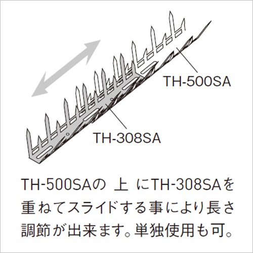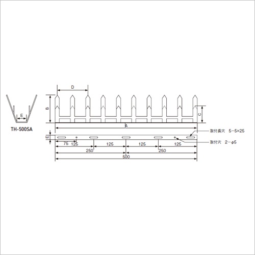 [サイズ] A500mm、B65mm、C35mm、D55mm、E1.5×25mm[本体重量] 320g [材質] SUS304 [仕上] BA ・画像3枚目の様にTH-500SAの上にTH-308SA(別売)を重ねてスライドする事により長さ調整ができます。 主な設置場所 駅、道路、高速道路、工場、倉庫、マンション、アパート、住宅、神社、仏閣、駐車場、屋外施設などでご使用いただけます。 下記のような場合にTH-OF・TH-800Bをご利用ください ・SUSアムレットTH-500SA・TH-308SAをパイプ等に取り付けたい場合(TH-OF・TH-800Bを2組以上でご利用ください)