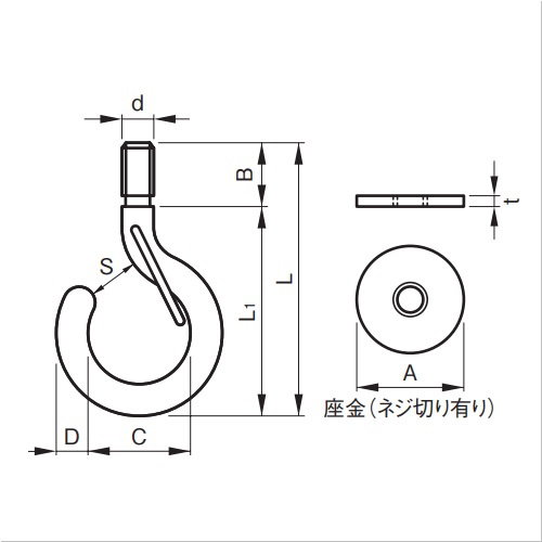 [サイズ]A:22mm、B:18mm、C:32mm、D:10.0mm、L:80mm、L1:62mm、S:16.0mm、d:M10mm、t:2mm[本体重量]129g [材質]SUS304 [仕上]光沢バレル研磨 [耐荷重]120kgf 購入に関する注意事項