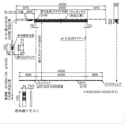 [品番/呼称]BKD-4028[重量]13.0kg [バトン棒]Φ25 BL=4000mm [吊点数]2点 [許容積載荷重]15kg [標準ストローク]2.8m [適用ボックスサイズ]200mm×200mm×4300mm 購入に関する注意事項 ・別注にて、バトン棒の長さをご希望のサイズに対応します。(最大4mまで) ・バトン棒キャップは標準ブラックですが、ご希望によりホワイトに変更できます。詳細はお問い合わせください。 特長 ・会議室や教室で15kg以内の掲示物を吊るすのに最適です。 ・赤外線リモコンと壁面埋込スイッチが標準で付属しています。 ・1台の送信機で最大5台のバトン(BKD)を操作できます。