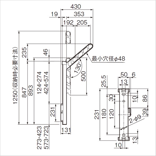 [用途]壁面直付用角支柱貫通用[サイズ]L=430mm [色]ホワイト [重量(1本あたり)]1.5kg [材質]ポール・ブラケット:アルミ、アーム:ADC [仕上]ポール・ブラケット:アルマイトクリア塗装、アーム:アクリル焼付塗装 [耐荷重]30kgf 購入に関する注意事項 特長 ・アームとポールの一体化により、使用しない時はアームをポールへ垂直に収納できる上下可動式ポールです。 ご注意 ・RCに取付けの際は、アンカーM8、ワッシャー、ナット又はボルト(各4個)をご使用ください。(別途) ・屋外物干の耐荷重に十分に耐えられる壁面及び支柱に取付けてください。また、避難経路を確保できる場所に取付けてください。 ・手すり乗り越え危険防止のため、収納時における穴下部が足のかかる部分より650mm以上になるように取付けてください。(ブラケット上部よりFL H803以上の位置) ・足掛かりの位置から足のかかる部分までの高さが650mm以上になるように設置してください。