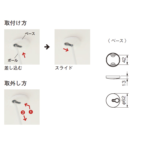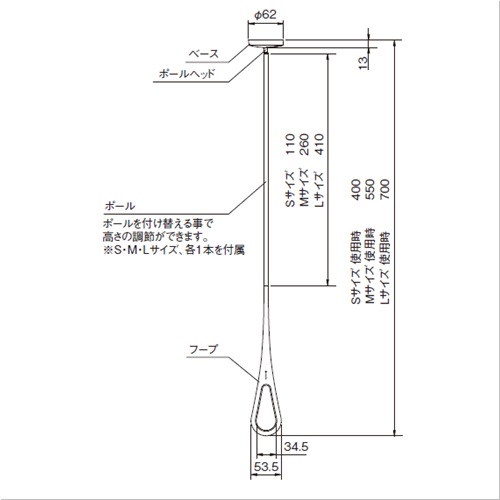 [色]ホワイト×グレー[本体重量]S:150g、M:170g、L:190g、ベース部:60g [材質]ベース:ポリプロピレン・ZDC、ポール:アルミ・SUS303、フープ: ポリプロピレン・エラストマー [仕上]ベース・ポールヘッド:サチライトクロムメッキ、ポール:アクリル焼付塗装 [耐荷重]8kgf [ポール]S 400mm、M 550mm、L 700mm [セット内容]ベースカバー1個、ポール(S・M・L各1本)、ポールヘッド1本、ジョイント1本、フープ1本、ベース1個、バインドタッピングネジ(ユニクロ)4×50 2本 購入に関する注意事項 特長 ・シンプルなデザインの屋内物干し ・設置スペースは少なく、使わない場合は簡単に外せます ・屋外での物干しが気になる場合や、夜干しのライフスタイルにおすすめ。観葉植物を吊り下げたり、天井空間を演出するアイテムとして活躍します。 ・ポール3本同梱(S、M、Lサイズ各1本) ・リング部内側には滑りにくいゴム系素材を採用 ・ベースの厚みはわずか1.3cm、デザイン性にもすぐれ天井に取付けてもすっきり。 ・取付、取外しが簡単。ベースの穴にポールを差し込み、中心に向かってスライドさせて取付けます。(取り外しは逆の動作) 傾斜天井には設置できません。