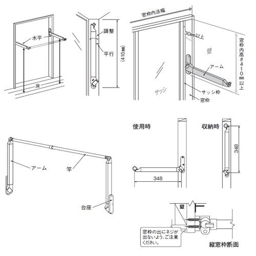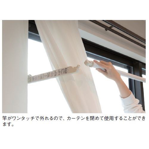 [材質]アーム:アルミ・ポリアセタール、ベース:アルミ、竿:スチール・ポリプロピレン(被覆)[アーム長さ]348 [窓枠内法幅]1860〜2170 [耐荷重]12kgf 購入に関する注意事項 特長 ・使う時だけパッと取り出し、使用後は竿ごと窓枠内に納まります。 ・洗濯物を干していても簡単にレースカーテンが閉められます。 ・従来の製品は、カーテンを開けて竿を倒してから、レースカーテンを捲り上げて竿の内側に入れるという苦労がありました。毎日忙しく家事をこなしている奥様にとっては、とても煩わしい作業です。 ・フレクリーンは、竿とアームがワンタッチで外れるので、簡単にレースカーテンを内側に入れることができます。 ご注意 ・取付けは窓枠見込30mm以上、窓枠内縦寸法410mm以上の取付スペースが必要です。使用時の出幅は約350mmです。 ・竿の長さを選ぶことで窓枠内寸法1240〜2170mmの範囲で取付可能です。 ・窓枠の強度が十分な場所に取付けてください。下地に木芯がなく取付けネジが効かない場所には取付できません。