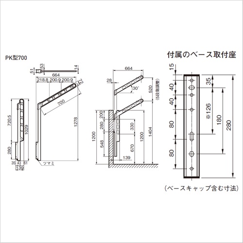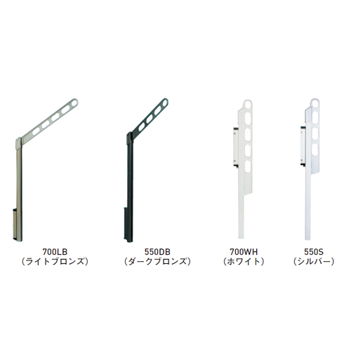[本体重量]2.6kg[材質]ADC [仕上]アクリル焼付塗装 [サイズ]700 [荷重目安](2本1組)30kgf [色]ダークブロンズ 購入に関する注意事項 ※代表を表示しています。 特長 ・ポールの長さは900mmのロングタイプです。多少低い位置に取り付けた場合でも、充分な高さで使用できます。 ・5段階の高さ調整が可能です。(130mmピッチ) ・アームは竿を差したままで縦型収納できます。 ・幼児には簡単に操作しにくい急落下防止機構を採用しています。 ご注意 ・手すり乗り越え危険防止のため、収納時における穴下部が足掛かりより650mm以上になるように取付けてください。 ・オールアンカー等をご使用の場合は、※の穴をご使用ください。他の穴を利用すると、ネジ出っ張りが、物干の可動部と接触して作動に不具合がでることがあります。