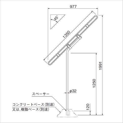 [色]ステンカラー[本体重量]2.6kg [材質]ADC・硬質ゴム、SUS304 [仕上]アクリル焼付塗装、研磨 [備考]奥行1100mm以上必要 購入に関する注意事項 特長 ・竿は効率のいい5本掛けで、角度があるため、洗濯物に日差しがまんべんなく当たり、乾きもスピーディです。 ・取付け位置が低いため、従来の平行物干に比べ楽に利用できます。 ・美観を損なわないシンプルなデザインです。コンクリートベースを地中に埋込めれば、一段とすっきりします。 ご注意 ・2本1組でご使用ください。 ・コンクリートベース(別途)、或いは243-895 スカイクリーンスタンド樹脂ベースIIをご利用ください。 ・外したスペーサーにポールを入れ、一緒に樹脂ベース本体に差し込みます。
