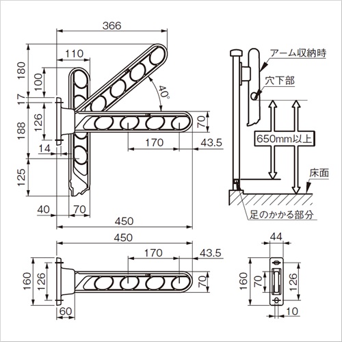 [サイズ]450x44x160mm[本体重量]555g [材質]ADC [仕上]アクリル焼付塗装 [荷重目安](2本1組)30kgf [色]S(シルバー) 購入に関する注意事項 特長 ・竿を持って3段操作(収納・水平・斜め40度)ができます。 ・直接アームとブラケットが、こすれない機構を採用しました。 ご注意 ・機構(公団)住宅AE-504、公共住宅E-405該当品は、ポールとセットした場合のみです。 ・手すり乗り越え危険防止のため、収納時における穴下部が足のかかる部分より650mm以上になるように取付けてください。