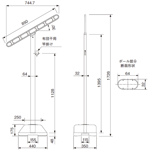 [サイズ]850mm×1726mm[本体重量]2.5kg [材質]ポール:アルミ/アーム:ADC [仕上]ポール:アルマイト/アーム:アクリル焼付塗装 [色]ポール:シルバー/アーム:ステンカラー 購入に関する注意事項 特長 ・マンション1階の庭付きバルコニーや、戸建住宅の庭置き式として最適です。 ・手摺り・腰壁のない1階の庭付きバルコニーの場合でも、上階の物干金物と景観を合わせることができます。 ・外観を重視し本体のポール部分にはアルミ材を採用。 ・竿掛け部分(アーム)との違和感がありません。 ・高さ1726mmの設定のため、小柄な方でも手が届きます。 ・樹脂ベースII(別売)は、ベース本体の中に水や砂を入れて簡単に使用することができます。(ベース内容量 水のみ:16kg)また、キャップがネジ式のため外れません。 ご注意 ・スカイクリーンスタンド2本1組あたりに掛けられる洗濯物の重さは目安荷重として15kgまでです。(無風状態の場合) ・必ず水平な場所に設置してください。 ・屋上など常に強風の吹く場所は、転倒の可能性があり危険です。 ・850SST本体は、組立式(1箱2本入)です。 ・樹脂ベースIIの出荷単位は1台です。 ・コンクリートベースをご使用の際は別途ご用意ください。