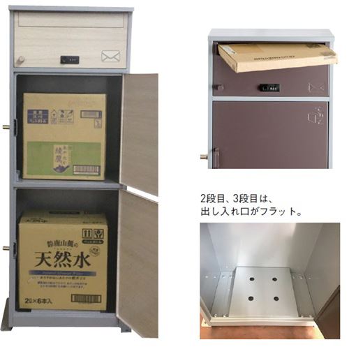 [材質]亜鉛メッキ鋼板[仕上げ]焼付塗装 [色]木目 [サイズ]H1140×W480×D290mm [備考]キー4本、印鑑ケース2個、使い方シール、アンカープラグ、コーナークッション4個 [重量]18.5kg 購入に関する注意事項 特長 ・「前入前出」タイプです。 ・留守でも複数荷物が受け取れる宅配ボックスです。 ・独立した2つの投函口で郵便・宅配便どちらにも対応します。 ・上段ポストは、可変式ダイヤル錠で任意の番号に変更可能です。 ・出入り口がフラットなので荷物の出し入れが簡単です。 ご注意 ・防滴仕様ですが、屋外への設置は強い風や諸条件によって雨水が浸入することがあります。