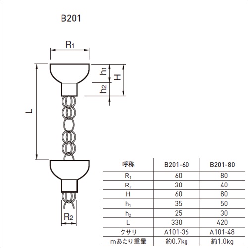 B201-60ハイカップチェーン カップと丸線の連結 カップ=銅 クサリ=A101-36 ・A101にハイカップをあしらった商品で特に和風住宅に最適です。 [品番/呼称]B201-60 [サイズ]L3000mm [重量]約0.7kg [材質]銅 [仕上げ]生地 [ご注意] ・チェーンの連続タイプは意匠商品のため、雨量により異なりますが雨水の散水等がございます。 ・納期:お問い合わせください。 ・Bタイプ各々に吊棒が1本付属しています。 ●R1:60、R2:30、H:60、h1:35、h2:25、L:330、クサリ:A101-36 購入に関する注意事項