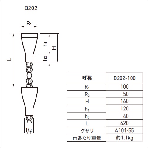 B202-100ジェットカップチェーン カップと丸線の連結 カップ=銅・アルミ クサリ=A101-55 ・A101にジェットカップを連結した商品で特に洋風住宅向きです。 [品番/呼称]B202-100 [サイズ]L3000mm [重量]約1.1kg [材質]アルミ [仕上げ]塗装 [ご注意] ・チェーンの連続タイプは意匠商品のため、雨量により異なりますが雨水の散水等がございます。 ・納期:お問い合わせください。 ・Bタイプ各々に吊棒が1本付属しています。 ●R1:100、R2:50、H:160、h1:120、h2:40、L:420、クサリ:A101-55 購入に関する注意事項