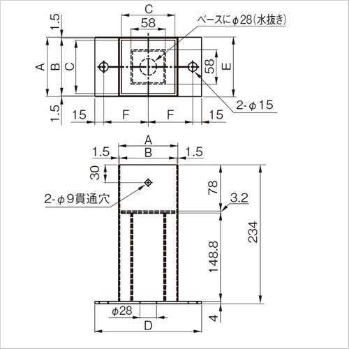 [サイズ]180x100x234mm[本体重量]2000g [材質]SUS304,座:SUS304,内部上板・中柱:スチール [仕上]ヘアーライン [安全荷重]500kgf 購入に関する注意事項 特長 ・水抜き穴があるので柱の腐食を防止します。 ・ボルトタイプは座に穴明け加工を施していますのでアンカー止めが可能です。 ご注意 ・特注サイズも製作可能です。別途お問い合わせください。 ・座をSUS304にしたい場合は、別注にて製作可能です。別途お問い合わせください。