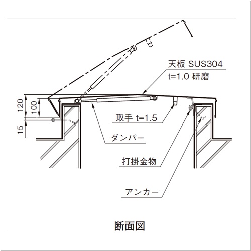先付タイプです。ガスダンパーにより安全に開閉できます。 [本体重量]16000g [材質]SUS304 [仕上]研磨 ●ダンパーテスト結果 開閉テスト:3万回開閉にて異常なし 温度テスト:高温:80℃ 48時間放置異常なし 低温:-20℃ 30時間放置異常なし 購入に関する注意事項 【要別途送料】別途送料が必要な商品です。詳細は営業へお問合せください。