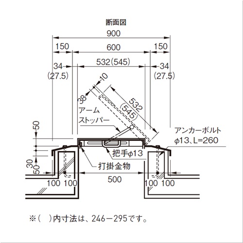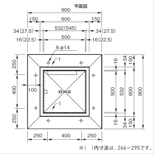 [サイズ]900×900×1.5mm[本体重量]17kg [材質]SUS304 [仕上]研磨 購入に関する注意事項 【要別途送料】別途送料が必要な商品です。詳細は営業へお問合せください。 ・特注対応にてアンカーボルト穴位置を指定することができます。納期・価格は都度お問い合わせください。 ご注意 ・ジンクロの場合は、耐候性向上のため仕上げ塗装をしてください。 ・アンカーボルト(φ13、L=260)はナット締付け後、雨水が内部にしみ込まないように、接合部をコーキングまたは溶接してください。(枠とナット部分、及びナットとアンカーボルト部分)