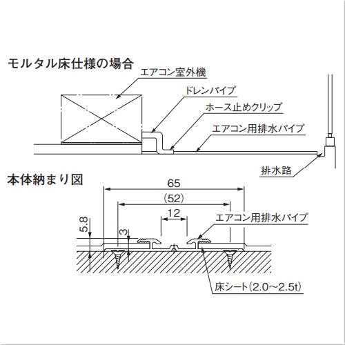 ・排水パイプを取付けるための前工事が不要で、後から簡単に取付けられます。・排水パイプを床シート押さえ金具として使用できます。 ・ホース止めクリップでホースが固定できます。 [本体重量]650g [材質]アルミ [サイズ]L=2000mm [カラー]シルバー 購入に関する注意事項 ご注意 1400mm以下の現場では2800mmのものから2本取りする方が経済的です。(ホース止めクリップ1個を別にお買い求めください)