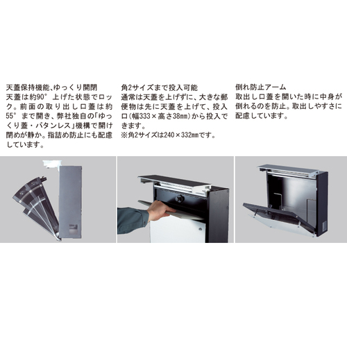 [色]ビビッドレッド(赤)[品番/呼称]CTCR2003R [サイズ]H390mm×W390mm×D145mm [重量]4.5kg [材質]本体: アルミ形材(ブラック色) 上パネル:アルミ形材(ヘアーライン) 前パネル材質:アクリル 側板:ASA(ブラック) 扉:溶融亜鉛メッキ鋼板 のぞき窓:アクリル [錠前]ダイヤル錠 購入に関する注意事項 特長 ・「前入前出」タイプです。 ・モダンさを追い求めたデザインで、エントランスにシャープな印象を与えます。 ・壁掛け・ポール取付け型です。奥行スリムでショートエントランスでもスペースを取りません。 ・幅広く使える13色をラインナップしています。 ご注意 ・防雨仕様ですが、屋外への設置は強い風や諸条件によって雨水が浸入することがあります。 ・ポール取付用部材(オプション)については、お問い合わせください。 ・納期:ご確認ください。