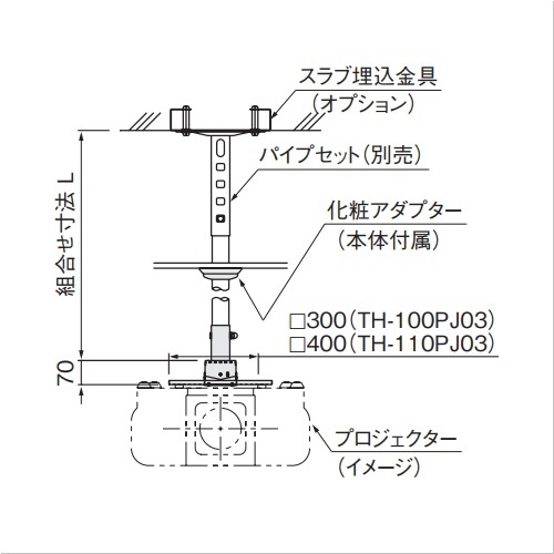 [色]アイボリー[品番/呼称]TH-110PJ03 [サイズ]ベース:400mm×400mm、H:70mm [重量]3.4kg [材質]スチール [仕上げ]半つや焼付塗装 ●備考:工場穴加工 購入に関する注意事項 ・パイプセット(TH-PAS)は含んでおりません。別途パイプセットをご注文ください。 ・ご注文の際に取付けるプロジェクターのメーカーと機種名をご連絡ください。取付け穴加工して出荷いたします。 特長 ・すぐにプレゼンテーションが開始できます。 ・プロジェクターを天井面に設置することにより視聴空間の有効利用が一段と進みます。 ・レベル調整作業が簡単に行えます。 ・納まりもすっきり、使用するプロジェクターに合わせて取付け穴加工後に出荷します。 ・吊りパイプは今までのディスプレイハンガーと共通です。 ・傾斜天井にも対応しておりますので設置天井は選びません。 ご注意 ・最大搭載荷重は25kgfです。 ・形式の違いは取付けベースの大/小です。