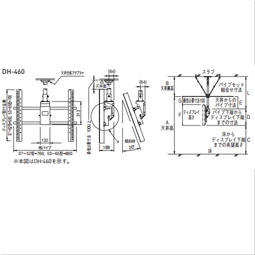 ・ユニバーサルアタッチメントで、幅広いディスプレイサイズに対応します。・吊りパイプは、薄型ディスプレイハンガー共通仕様です。 計算式 ●天井からディスプレイ上端までの寸法G=A?C?F≧100 ●天井から出るパイプ寸法E=G+0.5F?190※ ●組合せパイプ長さL=A+B?C?0.5F?190※ A天井高:床から天井までの高さ B天井裏高:天井裏(フトコロ)の高さ C床からディスプレイ下端までの希望高さ H1/2F+190※ E天井から出るパイプ寸法 Fディスプレイ本体高さ Gディスプレイ上端から天井までの高さ(※必要最低寸法100mm) L組合せパイプ寸法 ※DH-460の場合のハンガーセンター位置。DH-300は135、TH-200は130を入れてください。 [色]ブラック [品番/呼称]DH-460 [重量]9.0kg [材質]スチール [仕上げ]半つや焼付塗装 [ご注意] ・ディスプレイに適応したハンガーをお選びください。(DH-460以外の詳細図は、お問い合わせください) ・ディスプレイのメーカー、機種をお知らせいただければ適応したハンガーを選定いたしますのでお問い合わせください。 ・パイプセットの長さ(組合せ寸法L)を決めて、ご注文ください。 ・スラブ取付板は水平と傾斜自在型があります。設置するスラブ面によりお選びください。 ・ハンガーパイプの揺れを軽減する為に振止めキットをご使用ください。(オプションとなります) ・天井化粧アダプター(TH-A30)は本体標準付属品です。0〜15°の天井傾斜に対応できます。 ・吊りパイプがL=1601〜3000mmの場合は、特注になりますのでご相談ください。 ・価格に吊りパイプセットは含んでおりません。 ●耐荷重:80kgf ●対応サイズ:37〜65インチ 購入に関する注意事項