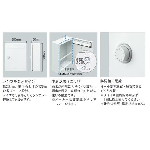 [色]漆喰ホワイト[品番/呼称]CTCR2502WS [サイズ]H390mm×W300mm×D120mm [重量]4.1kg [材質]本体・扉:SGCC鋼板(粉体塗装)、投函口:ASA樹脂(アクリル塗装) ダイヤル錠:耐候性樹脂 購入に関する注意事項 特長 ・「前入前出」タイプです。 ・省スペース設計で、スペースのないエントランスでもすっきり・軽快に設置できます。 ・アパート(集合住宅)では、一カ所集中の設置、玄関ドア横での(戸別)設置を問わず、壁掛けで設置できます。 ・戸建住宅では、壁掛け、またはポール取付けで設置できます。 ・表面はキズが付きにくいサンド塗装です。 ・角2サイズ(240×332mm)まで投函できます。 ご注意 ・防雨仕様ですが、屋外への設置は強い風や諸条件によって雨水が浸入することがあります。 ・施工は背面取付け専用です。側面取付けはしないでください。(ポスト同士を横連結する以外は、側面穴は使用しません。) ・アパート用部屋番号シール・戸建住宅用ポール取付用部材(オプション)については、お問い合わせください。 ・納期:ご確認ください。