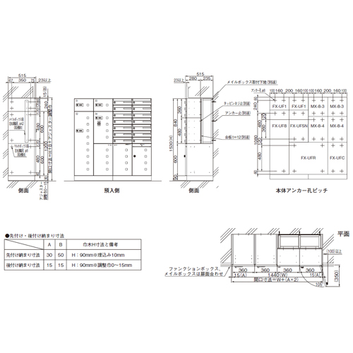 多機能ボックス(宅配ボックス) [サイズ]360×360×515mm [材質] (箱本体)スチール 0.8t メラミン樹脂焼付塗装 ダークグレー (扉)ステンレス 0.8t ヘアライン仕上 クリアー焼付塗装 透明アクリル樹脂 [重量]9.1kg 購入に関する注意事項 納期:受注生産となります。 特長 ・「前入前出」タイプです。 ・メイルボックスと組み合わせができるワイド360mmのコンパクト・多機能ボックスです。 ・宅配ボックスは誰にでも使える4桁暗証番号ダイヤル式で、操作が簡単です。 ・店屋物返却用リターンボックスは鍵がないのでいつでも自由にご利用できます。 ご注意 ファンクションボックスとメイルボックスの扉面を合わせた設置の場合のみ、ファンクションボックスとメイルボックスの一部連結が可能です。 対象機種:MX-8e MX-18 MX-20e