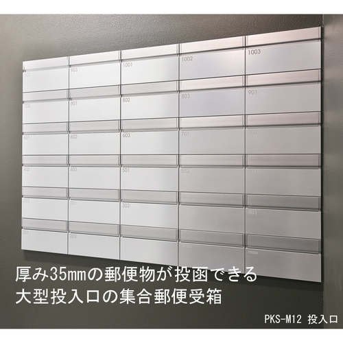 [品番/呼称]PKS-M12-2[サイズ]H240mm、W280mm、D465mm [重量]6.3kg [材質]本体:高耐食溶融めっき鋼板0.7t 扉・フラップ:アルミ押出型材 投入側パネル:アルミ板 [仕上げ]本体:高耐食溶融メッキ 扉・フラップ:アクリル焼付塗装(シルバーメタリック) 投入側パネル:アルマイト 購入に関する注意事項 特長 ・厚さ35mmの郵便物が投函できる大型投入口の集合郵便受箱です。 ・広い投入口でも郵便物を抜き取りにくいセキュリティ構造(盗難防止)です。 ・前入後出タイプの屋内仕様です。 ・日本郵便株式会社の大型郵便受箱の推奨規格に適合した集合郵便受箱です。大型の郵便物や宅配便各社のメール便に幅広く対応します。 ・投函可能サイズ:縦340×横260×厚さ35mm ・本体に扉が収納されているため、壁同面で施工が可能です。 ・暗証番号は0桁(フリー機能状態)〜8桁まで自由に設定できる可変式プッシュ錠です。 ・ES仕様は、扉をお好きな種類の塩ビシートで自由にデザインできます。 ご注意 ・ES仕様は、受注生産となります。 ・納期:ご確認ください。