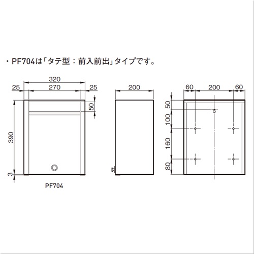 PF704は「タテ型:前入前出」タイプです。 [サイズ]H390mm、W320mm、D200mm [本体重量]3.6kg [材質]SUS304 [仕上]ヘアーライン・塩ビシート ●錠前:ラッチロック錠 【ご注意】防滴仕様ですが、屋外への設置は強い風雨や諸条件によって雨水が浸入することがあります。屋内・屋外仕様です。PF704はラッチロック錠仕様です。シリンダー錠及びダイヤル錠も製作可能です。 購入に関する注意事項 【要別途送料】別途送料が必要な商品です。詳細は営業へお問合せください。