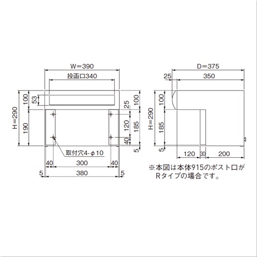 横型・前入後出・埋込タイプです。壁厚に合わせてポスト前面のスペーサが取外し可能です。 本体は住宅側の出幅を最小限にした905シリーズと、施工性を考慮した915シリーズの2種類がございます。 口金は丸みのある優しいイメージのRタイプと直線的でシャープなイメージのCタイプがあり、カラーバリエーションも多様です。 本体の天面に補強材を取付け強度アップしました。 取出口には、扉を開けた時の郵便物の落下を防止するストッパーがついています。 扉が開いたまま一時的にストップする扉ストッパーが付いているので片手で郵便物を取出すことができます。 [サイズ]H290mm、W390mm、D275mm [本体重量]5.9kg [材質]SUS304 [仕上]ポスト口:ヘアーライン・塩ビシート 本体:No.4 ●錠前:ラッチロック錠 【ご注意】防滴仕様ですが、屋外への設置は強い風雨や諸条件によって雨水が浸入することがあります。屋内・屋外仕様です。 購入に関する注意事項 備考 代表画像を表示しています。