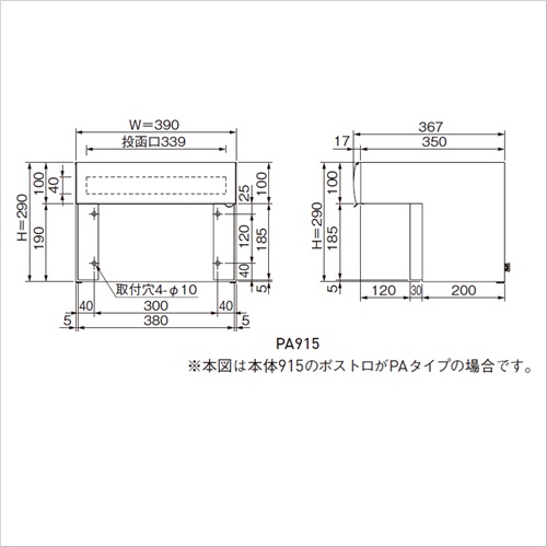 ・横型・前入後出・埋込タイプです。・壁厚に合わせてポスト前面のスペーサーが取外し可能です。 ・口金は投入口が見えないシンプルなイメージのパネルタイプです。 ・本体の天面に補強材を取付け強度アップしました。 ・取出口には、扉を開けた時の郵便物の落下を防止するストッパーがついています。 ・扉が開いたまま一時的にストップする扉ストッパーが付いているので片手で郵便物を取り出すことができます。 [色]ウォールナット [品番/呼称]PA915 [サイズ]W290mm、H390mm、D367mm [重量]6.4 [材質]SUS304・アルミ [仕上げ]ポスト口:塩ビシート 本体:No.4 [ご注意] ・防滴仕様ですが、屋外への設置は強い風雨や諸条件によって雨水が侵入することがあります。 ・屋内・屋外仕様です。 ・PAシリーズはポスト口単体では販売しておりません。 ●錠前:ラッチロック錠 購入に関する注意事項