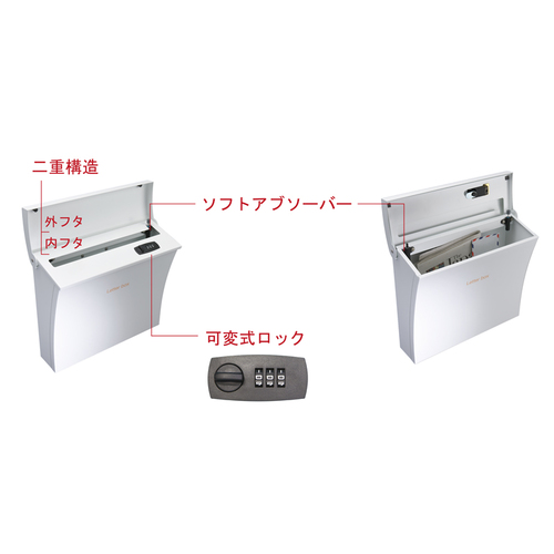 [色]シルバー[サイズ]H336mm、W390mm、D148.5mm [重量]4.3kg [材質]本体・扉共に高耐食溶融めっき鋼板 [仕上げ]粉体塗装 購入に関する注意事項 特長 ・なめらかな美しい曲線で構成された優しい印象のデザインポストです。 ・上入上出です。 ・外フタ・内フタの二重構造で、内部への雨水の浸入をしっかりと防ぎます。 ・外フタ・内フタの両方にソフトアブソーバーがついており、フタがゆっくりと静かに閉まります。 ・錠前は、暗証番号を変更できる可変式ロックです。 ご注意 ・防滴仕様ですが、屋外の設置は強い風や諸条件によって雨水が浸入することがあります。