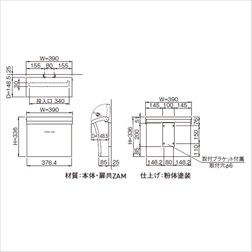 [色]ホワイト[サイズ]H336mm、W390mm、D148.5mm [重量]4.3kg [材質]本体・扉共に高耐食溶融めっき鋼板 [仕上げ]粉体塗装 購入に関する注意事項 特長 ・なめらかな美しい曲線で構成された優しい印象のデザインポストです。 ・上入上出です。 ・外フタ・内フタの二重構造で、内部への雨水の浸入をしっかりと防ぎます。 ・外フタ・内フタの両方にソフトアブソーバーがついており、フタがゆっくりと静かに閉まります。 ・錠前は、暗証番号を変更できる可変式ロックです。 ご注意 ・防滴仕様ですが、屋外の設置は強い風や諸条件によって雨水が浸入することがあります。