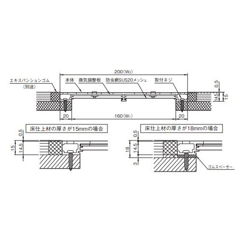 [色]B5W型木目調[材質]アルミ [サイズ]溝幅W1:160、溝幅W2:200、長さL:900mm [重量]1.77kg [備考]防虫網付 購入に関する注意事項 特長 ・下張り材の厚さに関係なく、床仕上材の厚さが15mmおよび18mmに対応できます。 ・防虫網なしの換気調整板付B5D型もできます。 ・自動換気調整板付(B5A型)もあります。お問合せください。 ご注意 蓋をつなげて使用する場合は、必ず断目を根太で受けてください。
